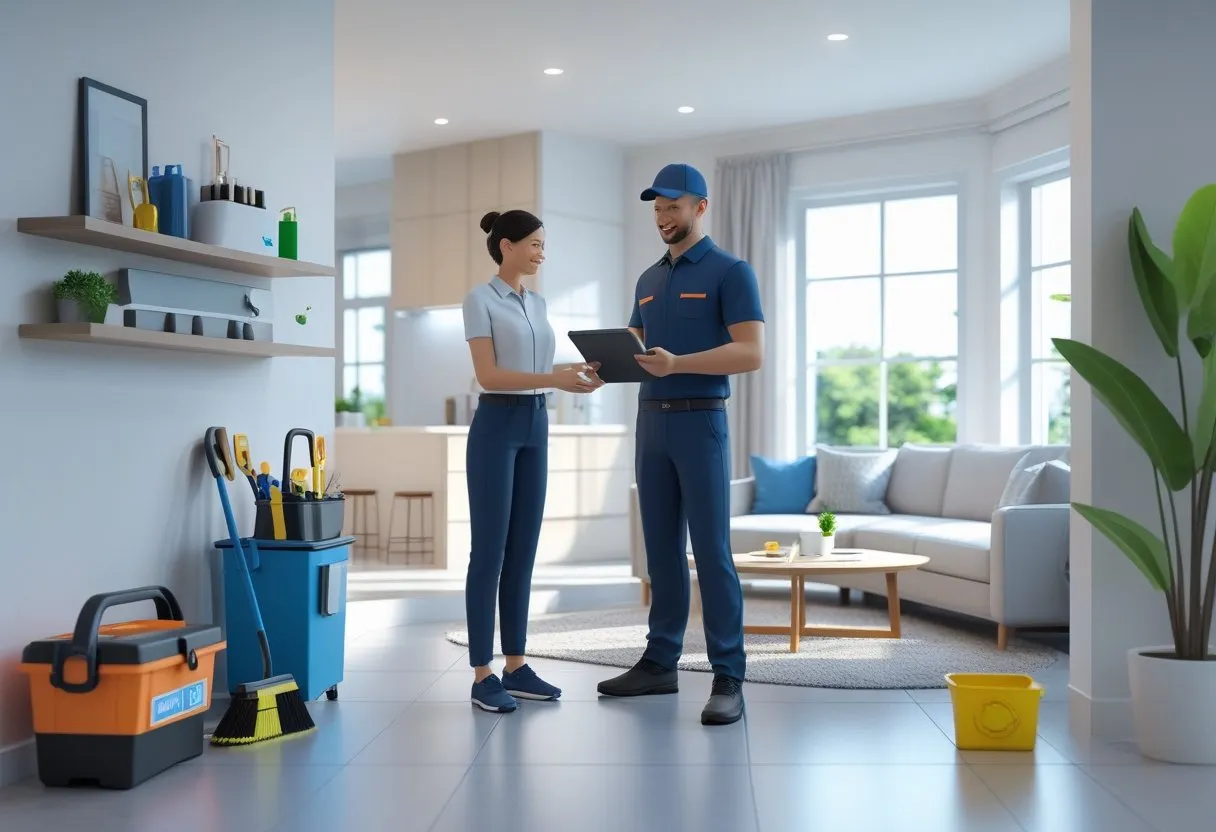 A homeowner receiving a checklist from a home service professional inside a bright, tidy living room with tools and smart home devices visible.