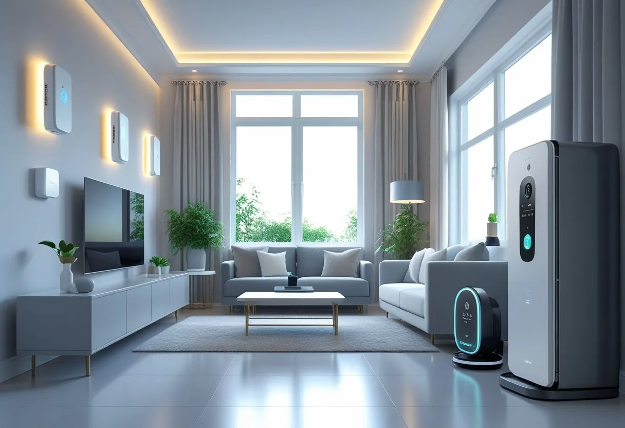 A modern living room with various smart home devices, including a thermostat, smart lights, speaker, security camera, smart refrigerator, and robotic vacuum cleaner.