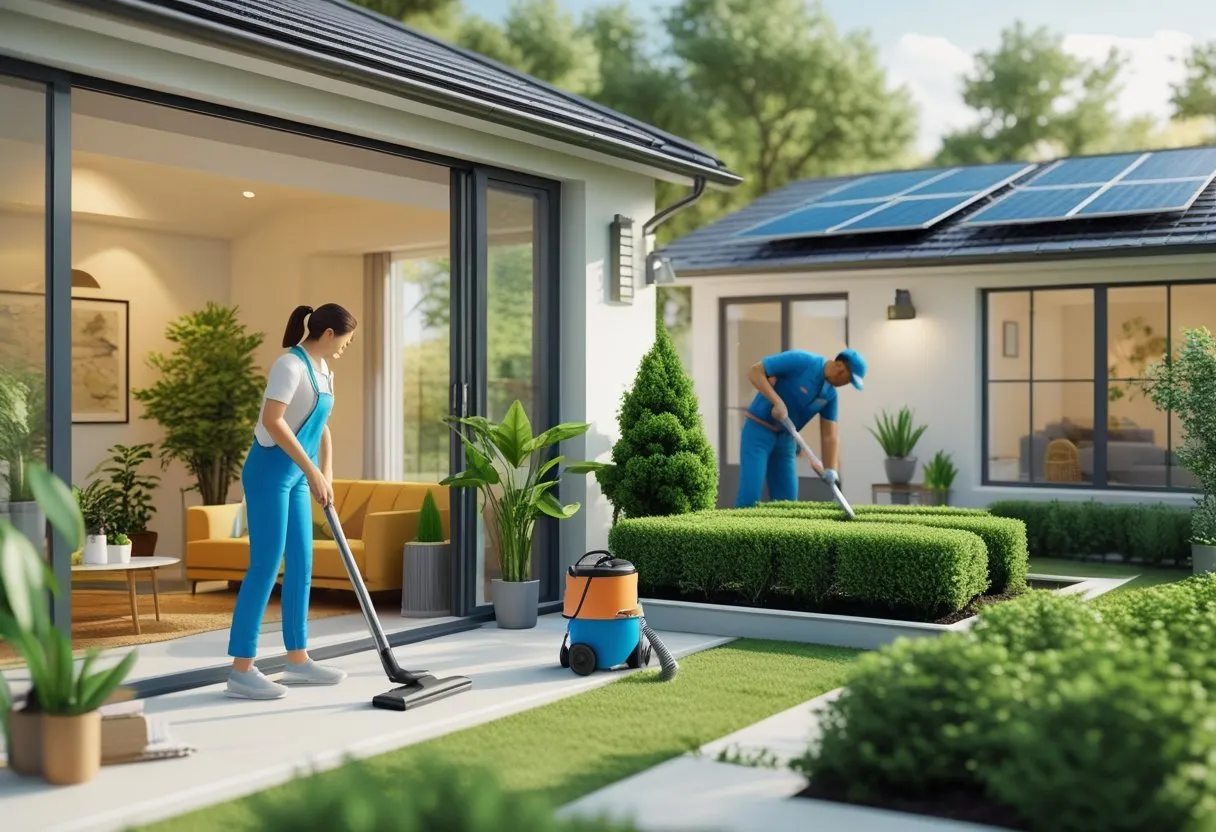 A home interior and garden scene showing people performing cleaning, plant care, gardening, and roof maintenance tasks.