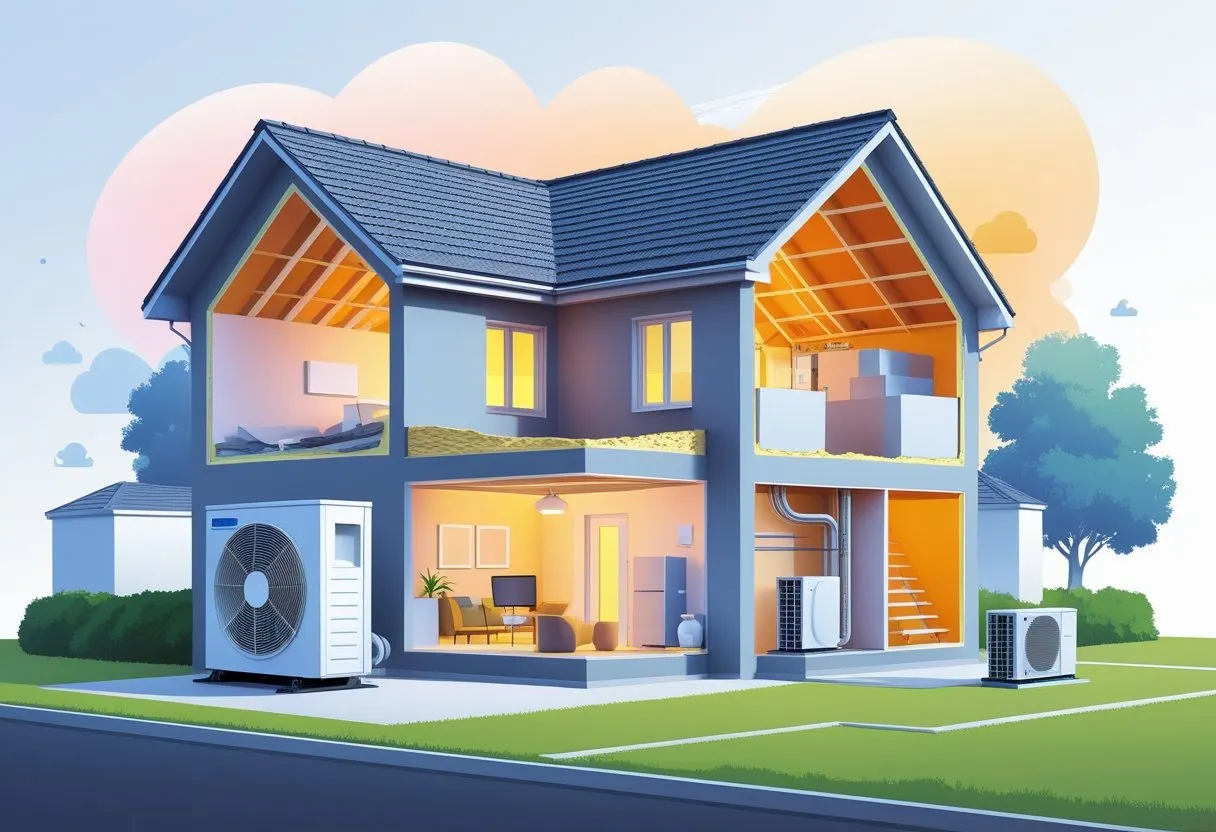 Cross-section illustration of a house showing heating and cooling improvements, including insulation, double-glazed windows, a heat pump outside, and a smart thermostat inside.