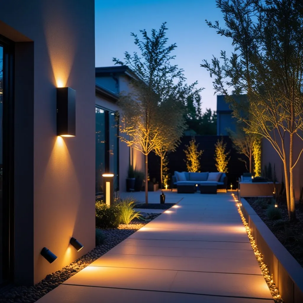 Use path lights and step lights for safety. Low-voltage LED stakes or integrated solar units work well for walkways. Accent lighting, such as uplights on trees and downlights on eaves, creates depth; place uplights 1–2 feet from trunks for an even wash and avoid pointing lights into neighbors’ windows.