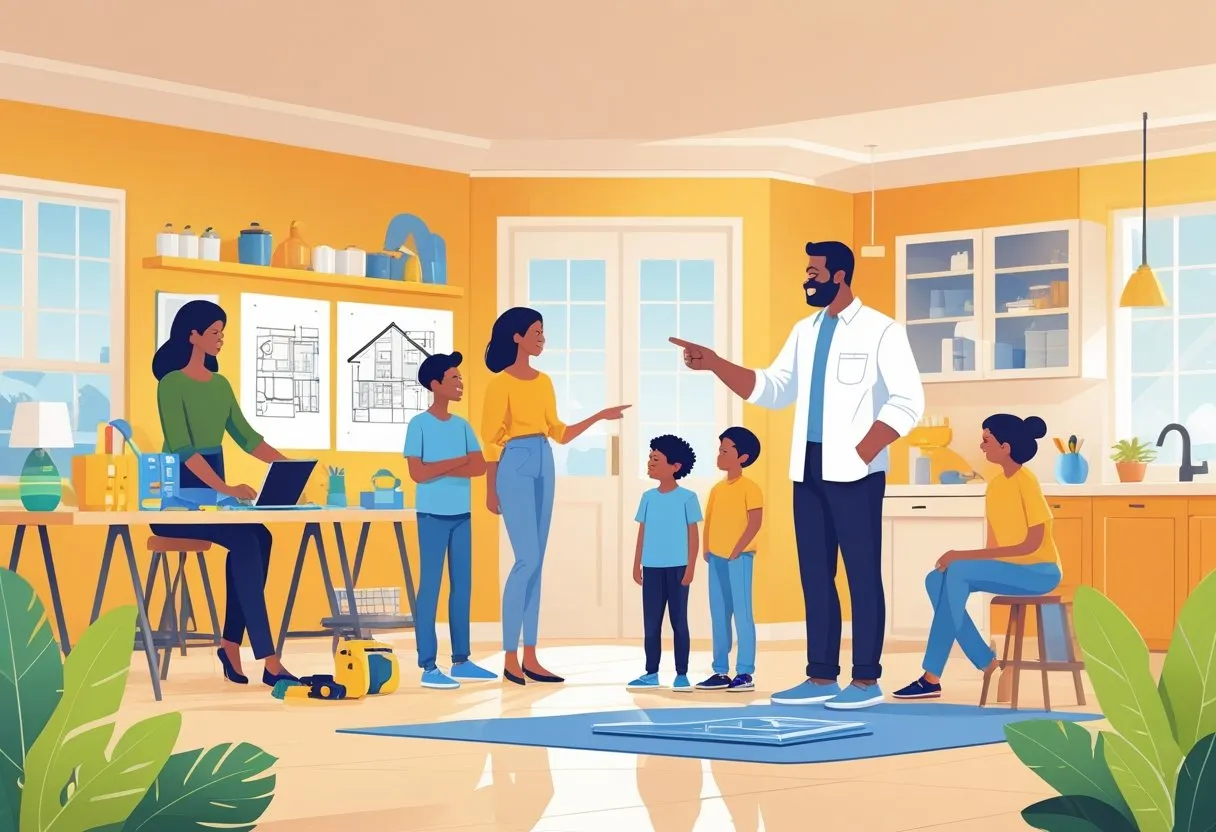 A family receiving expert advice on home repair and quality home goods inside a bright, organized room. You’ll find actionable planning steps, hands-on DIY resources, and guidance for when to hire a pro.
