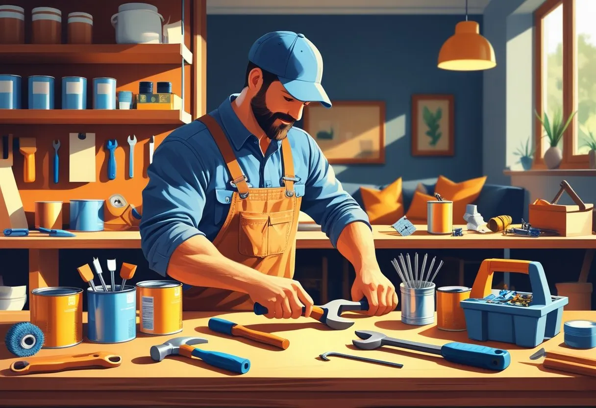 A handyman working with tools in a workshop surrounded by shelves of home repair supplies and a cozy living room visible in the background.