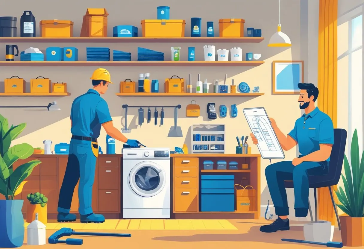 A home interior where a technician repairs an appliance while a homeowner receives advice near shelves of home goods.